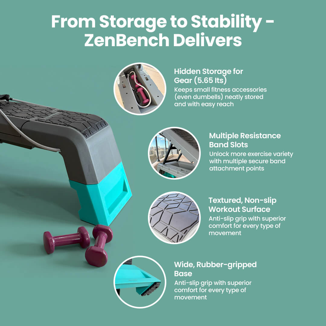 Crafted with a heavy-duty plastic frame and lightweight reinforcement rods, ZenBench stays rock-solid even during the most intense workouts. Its wide, rubber-gripped base ensures extra stability, giving you complete confidence with every squat, step, and lunge.